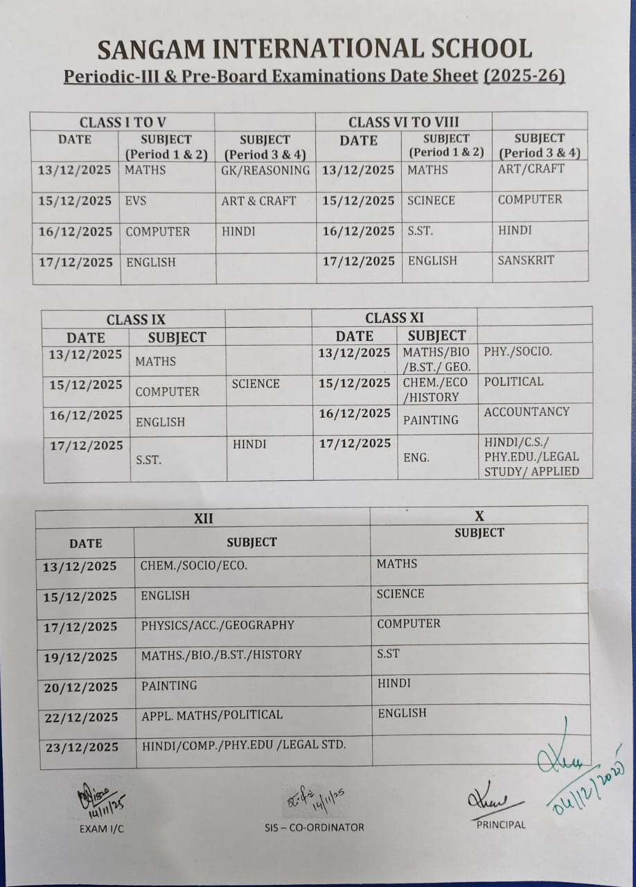 PERIODIC TEST III & Pre-Board Examinations Date Sheet for 2025-26